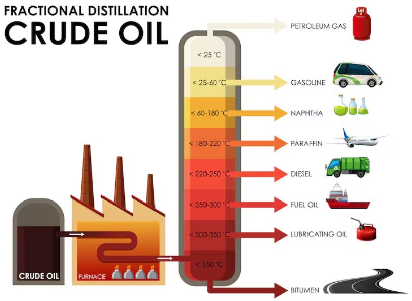ナフサは、原油を加熱して蒸留する過程で、ガソリンとほぼ同じ温度域(約 35°C 〜 180°C)で取り出される液体です。別名「粗製ガソリン」とも呼ばれます。